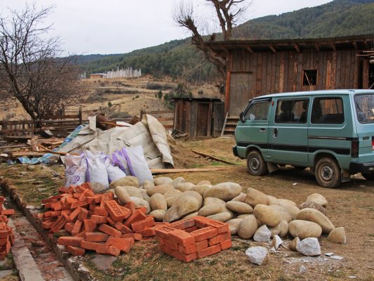 For Christof, the 300km drive from Thimphu to Ura village in Bumthang was a wild ride that took 14-hours on bumpy and winding roads. The oven building team endured anxious hours wondering if the material had survived the roads. They thought it a miracle when the Pick Up car and cargo reached safely at about 3200 m.