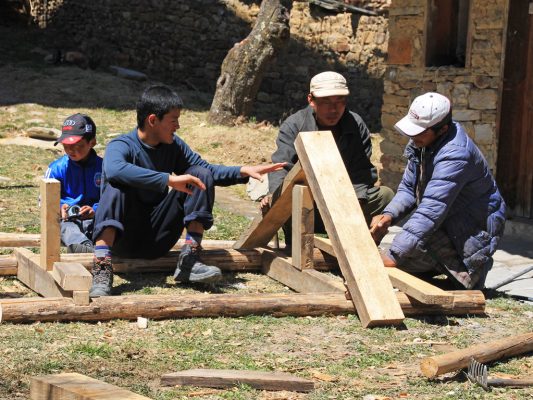 But first the oven had to be built: Often, the flapping of the prayer flags in the strong wind of Ura was the only audible sound while the foundation was dug. Calmly and steadily, in the thin air of this altitude, the team carried boulders, bags with cement and buckets of sand to the construction site. When Christof heated water with an immersion heater and put his finger inside to test the temperature Ugyen yelped horrified “if you do that with one of our devices you are dead!” Sonam started cutting the river boulders with a Flex and at once some villagers gathered, excitedly flailing their hands and discussing. “They are astonished that we can cut such huge boulders with such a tiny machine” Sonam remarked smilingly. During a sudden power outage which lasted for days nobody got angry. Later the water was also gone. In Bhutan folks are used to switch to “plan B” and from now on the boulders were cut the traditional way: by hand. Nothing can be enforced in Bhutan.