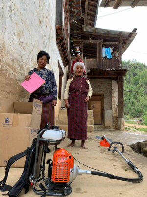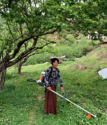 Zu ihrer Freude bekam sie vor ein paar Wochen vom Verein Bhutan Network ein Grasschneidegerät mit einem speziellen Aufsatz für die Reisernte geschenkt. Das Gerät im Wert von Nu. 27, 858 (ca. 315 EUR) ist das bisher einzige, das sie in ihrem Leben geschenkt bekommen hat. Meine Tante ist daher unglaublich dankbar. Ihre Arbeit beim Gras- und Reismähen wird von nun an so viel leichter sein. Als alleinerziehende Mutter, ohne genügend Arbeitskräfte im Haushalt, ist ein solches Erntegerät auch eine Riesenerleichterung!