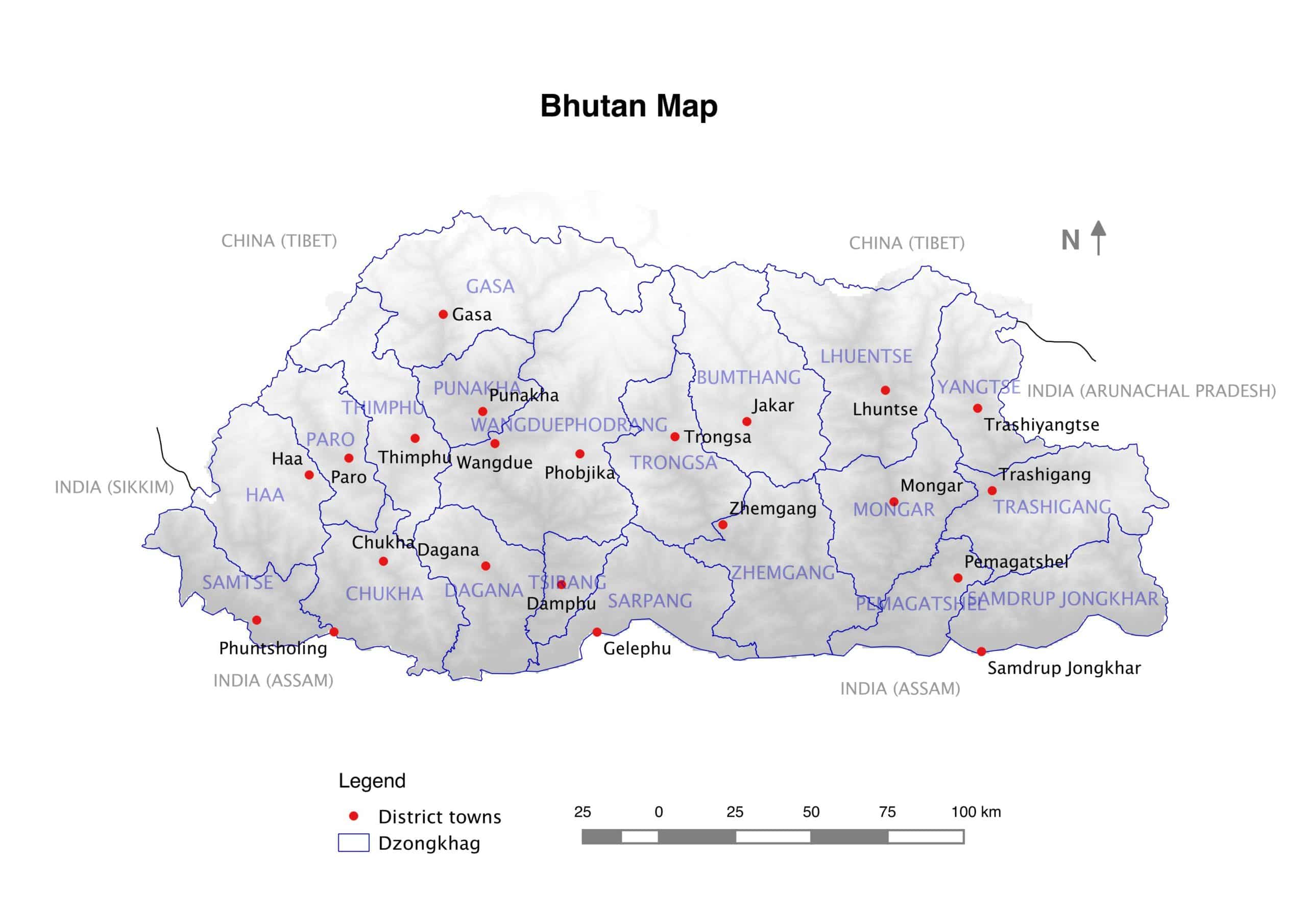 Bhutan – in the National language Dzongkha referred to as “Drukyul”, the “Land of Thunder Dragon” or Druk Gyalkhab, “Thunder Dragon country”– is situated in the eastern Himalayas. Bhutan is landlocked between the two densely-populated giants India and China (Tibetan Autonomous Region) with a land area of 38,394 square kilometers, of which approximately 71% are forested. Article 5 of the Constitution of the Kingdom of Bhutan states that a minimum of 60% of Bhutan’s total land area has to be maintained under forest cover for all time.As of 2019, the projected population amounts to 734,374 .